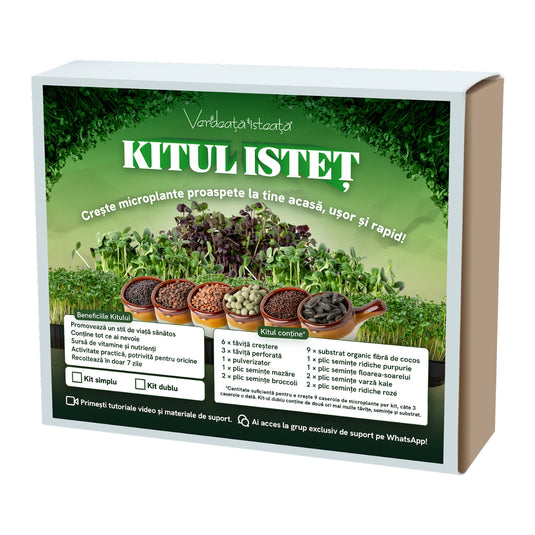 Kitul Isteț conține tot ceea ce ai nevoie pentru a crește microplante proaspete în confortul casei tale: de la substratul organic și semințele atent selectate, până la tăvițele de germinare și pulverizatorul pentru udare.